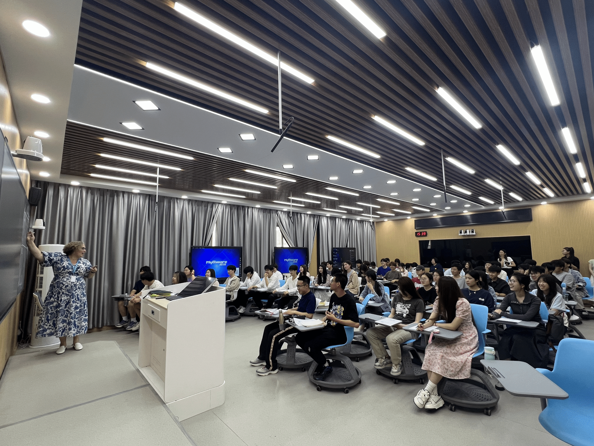 下午,新方老师参观了学院的智慧教室,并为全院同学上了一堂精心设计的语言能力提升课程,通过课堂提问、小组协作等方式,充分调动同学们的积极性。同学们积极参与教学活动,课堂气氛热烈。