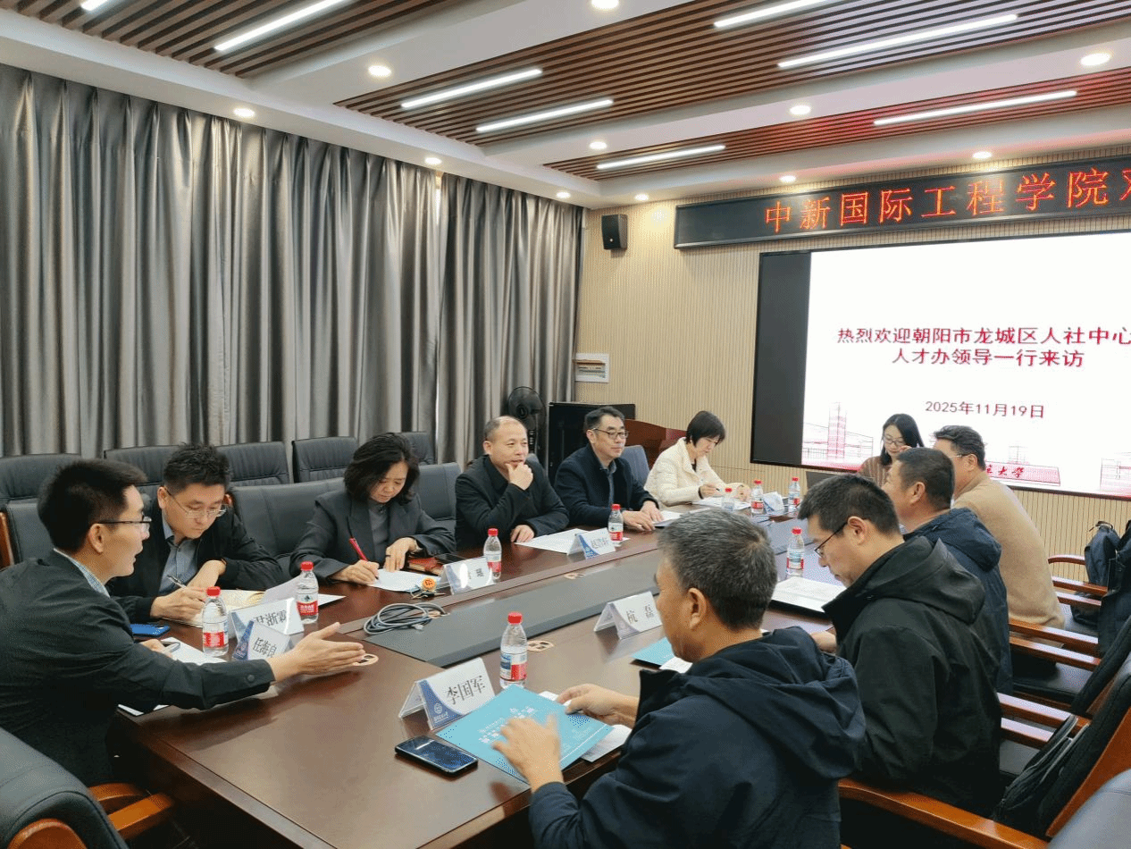深化校地协同合作,搭建人才培养、创新创业与就业服务的共赢平台,11月19日下午,朝阳市龙城区人社中心、区委人才办一行来访,双方校地合作座谈会在丙2-503会议室隆重举行。双方围绕就业创业合作、人才引育留用等核心议题深入交流,达成多项共识并签署系列合作协议。 朝阳市龙城区人社中心专职副书记刘佳辉、区委人才办副主任杭磊、龙城创业创新孵化基地运营方总经理常刚,沈阳建筑大学党委学生工作部部长赵浩轩、工程训练与创新创业学院副院长杨梅以及学院班子成员出席座谈会。