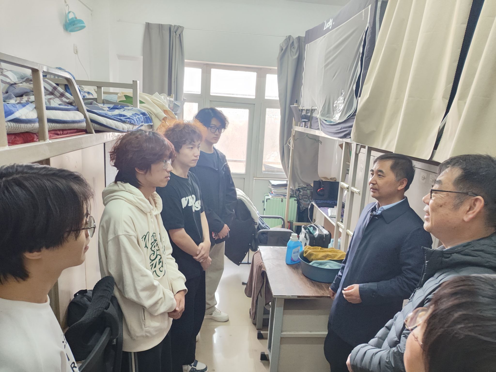 走访期间,夏校长对宿舍用电安全、环境卫生等方面进行了细致检查,针对发现的安全隐患,指导学院尽快安排相关人员处理,消除潜在风险。在与同学们的交流中,夏校长提出了三点殷切希望:第一,强化安全意识,宿舍安全关乎每一位同学的切身利益,大家要共同努力,全方位筑牢宿舍安全防线,确保宿舍生活安全有序;第二,保持良好的卫生习惯,春季是各类疾病的高发季节,勤开窗、多通风,做好个人卫生和健康防护,共同营造一个整洁、舒适、健康的生活环境;第三,珍惜在校的宝贵时光,扎实学习专业知识,提升专业技能。积极参加学科竞赛,在实践中锻炼自己的能力,提前做好职业规划,明确未来发展方向,不断提升专业能力和综合素质,为将来步入社会做好充分准备。夏校长还就自控力的培养和终身学习能力的培养等话题与同学们分享了自己的经验心得。